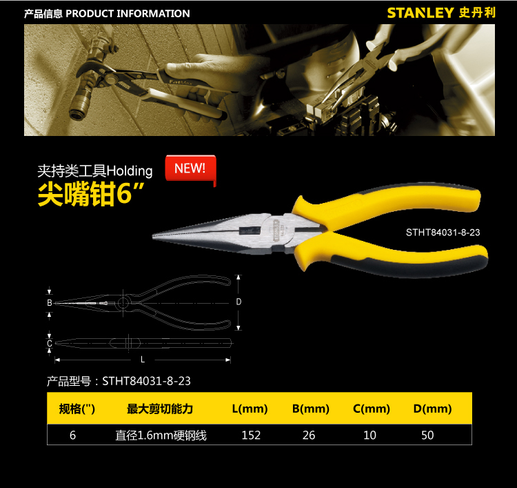 史丹利专业尖嘴钳6寸8寸老虎钳长嘴钳