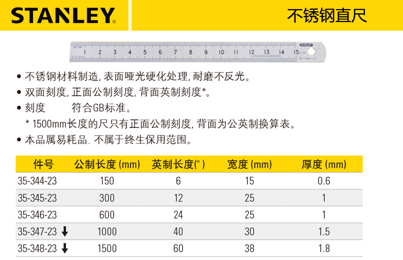 史丹利不锈钢直尺15/30/60cm双面公英制刻度长加厚铁尺