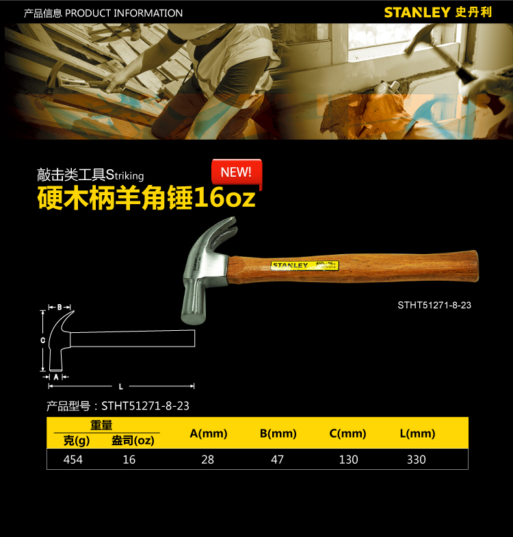 史丹利羊角锤一体木柄起钉锤木工锤铁榔头锤